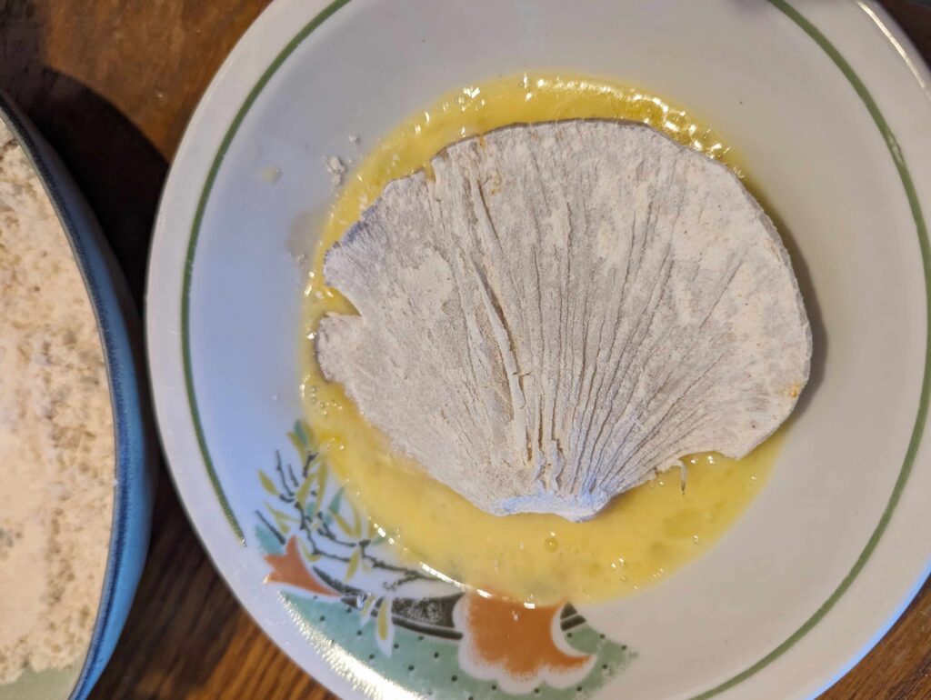 - Pilkosios kreivabudės kepurėles gerai išvoliokite miltuose, tada merkite į kiaušinio plakinį ir vėl į miltus ( stenkitės vieną ranką naudoti miltams, o kitą kiaušinio plakiniui, kad visgi miltai su kiaušiniu atsidurtų ant grybų, o ne ant jūsų pirštų:) )